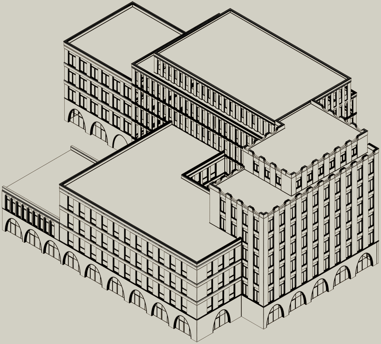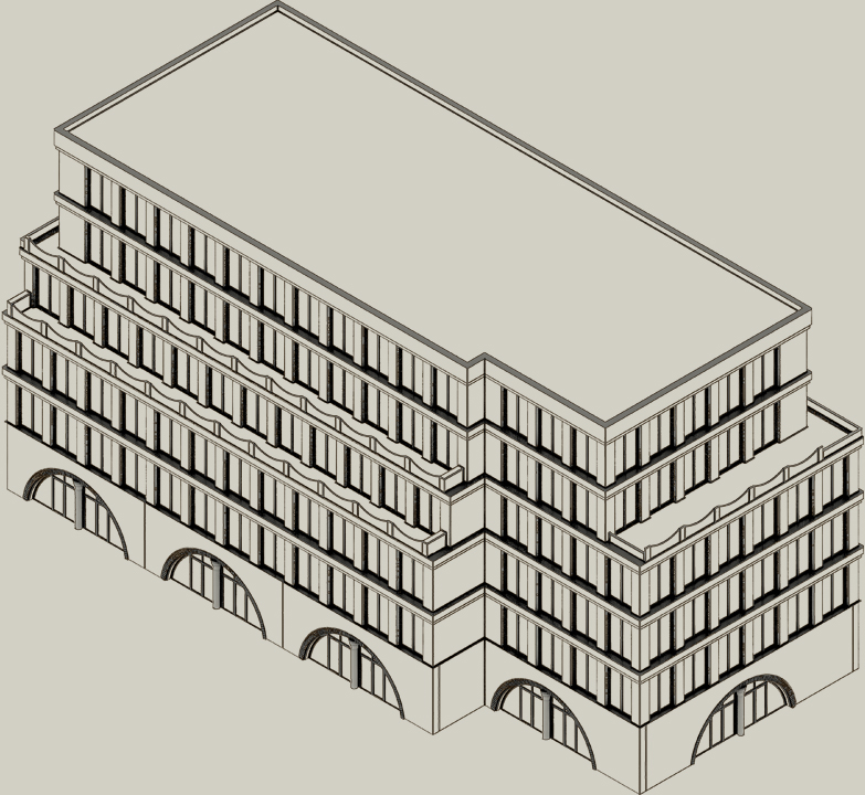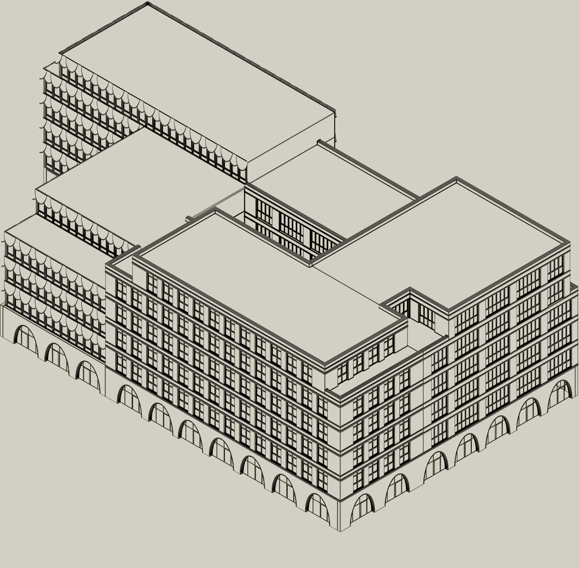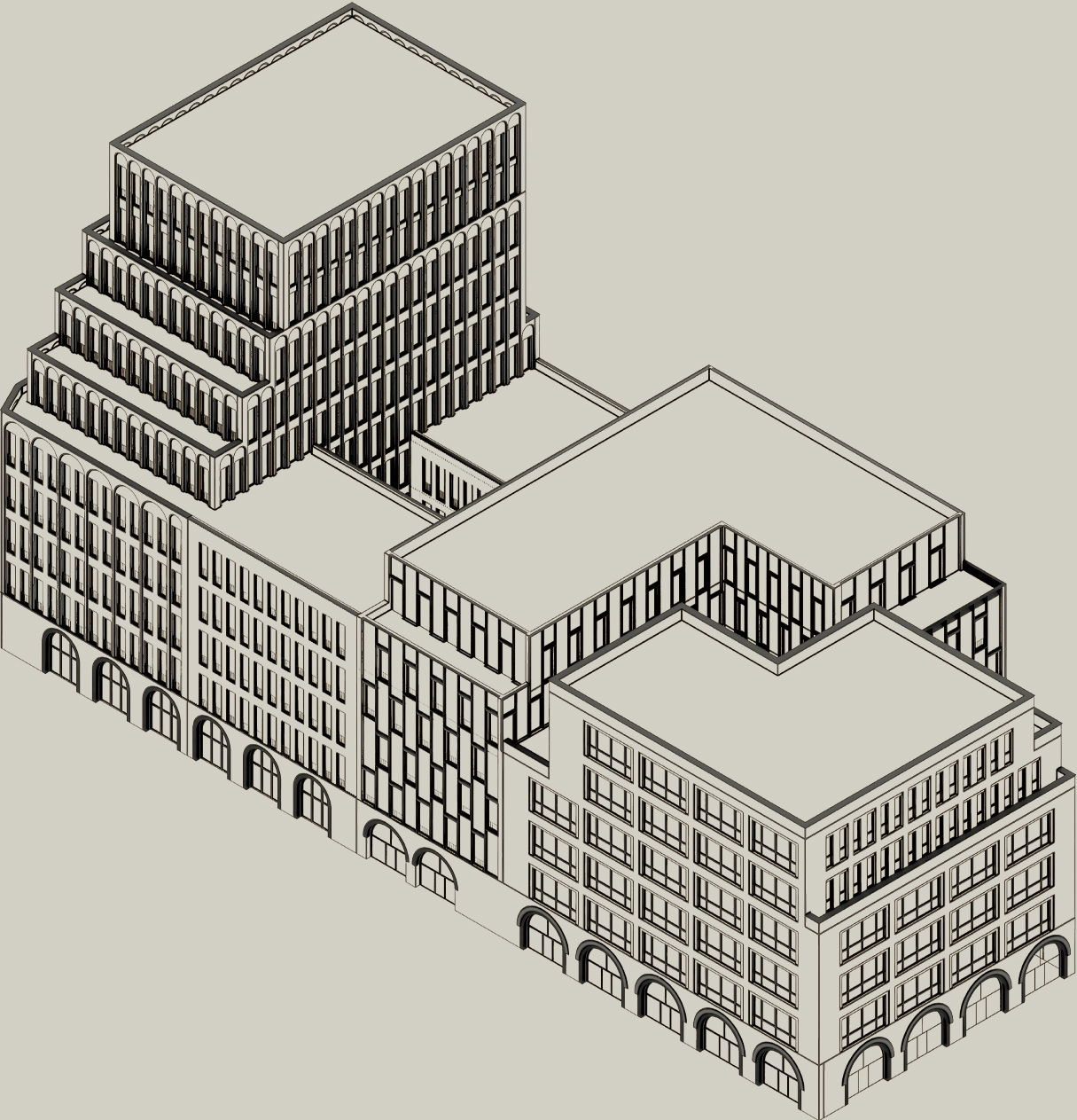 Die helle strukturierte Fassade des Hauses ZWEI zeigt moderne Bürowelten an, während sie mit dem klassischen Sockelmotiv im Quartier verankert ist.