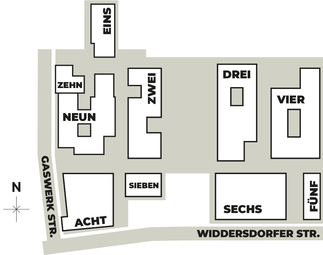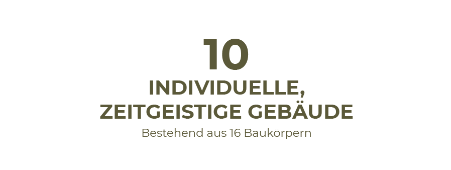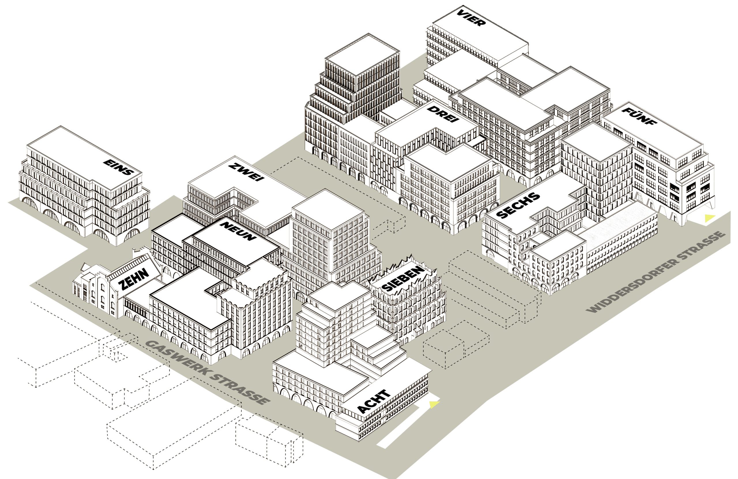 THE WID besteht aus zehn eigen­stän­digen Gebäuden, die jeweils real­ge­teilt, indi­vi­duell gestaltet und separat mit eigener Adresse nutzbar sind.