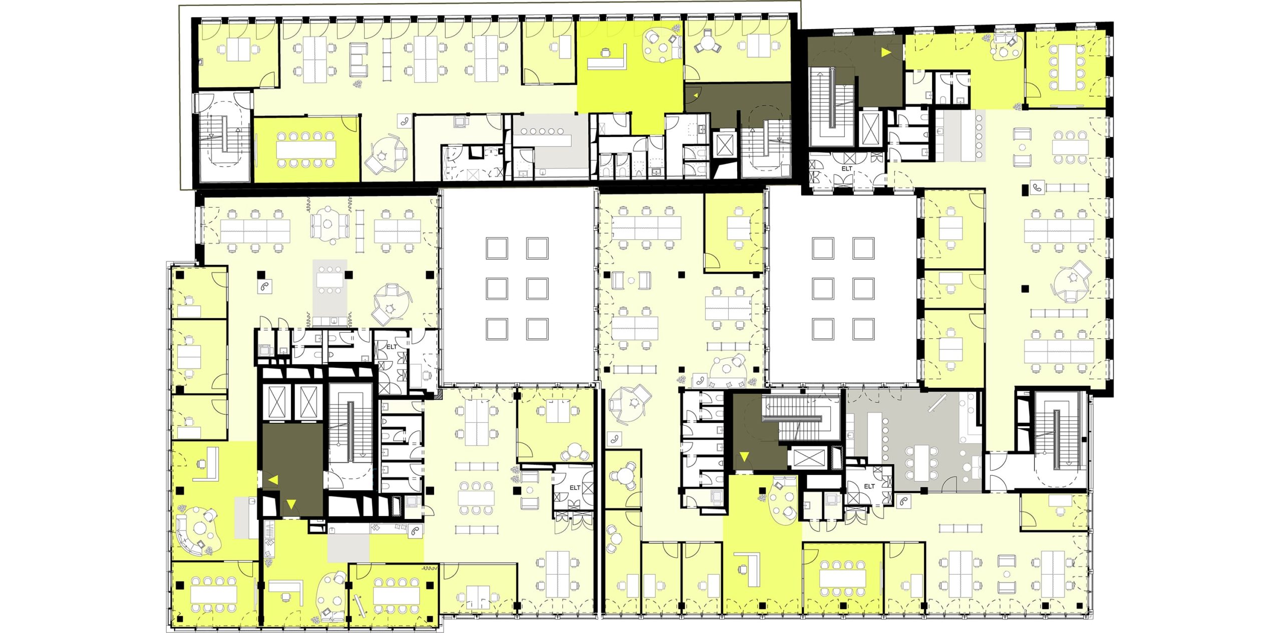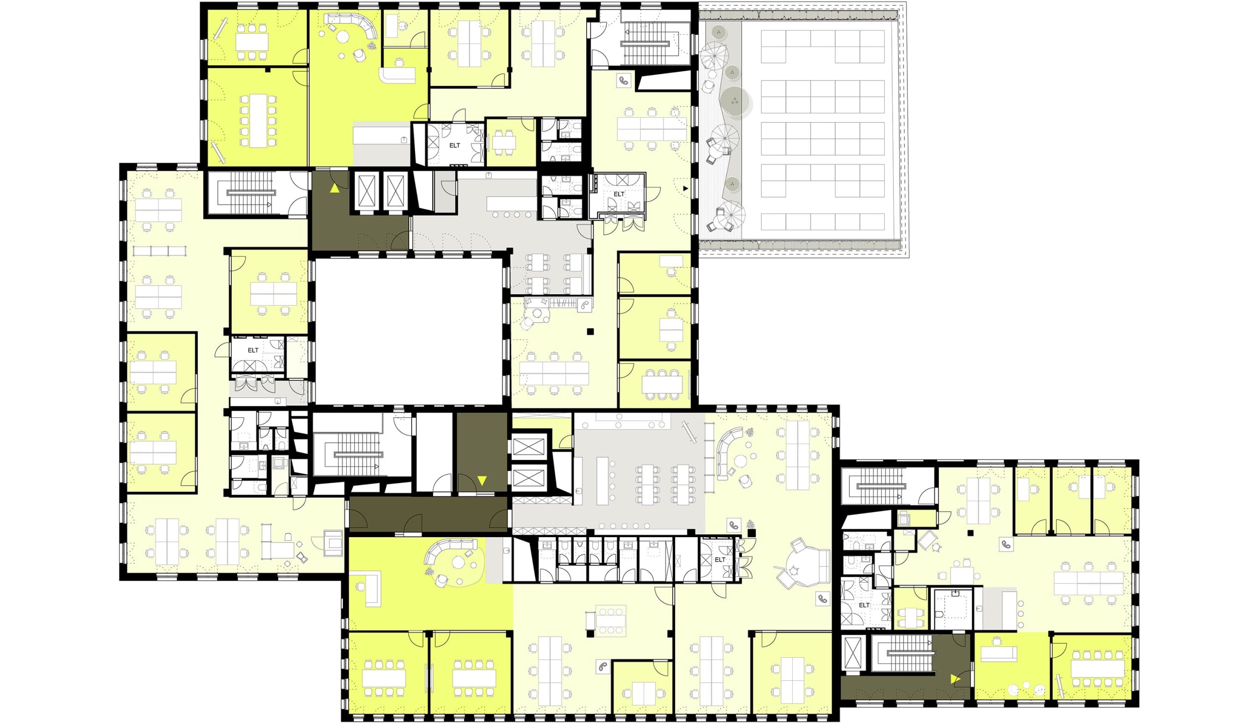 Teilbar in zwei autark funk­tio­nie­rende Gebäu­de­körper mit ca. 8.120 m² (VIER.1) bzw. 5.780 m² (VIER.2)